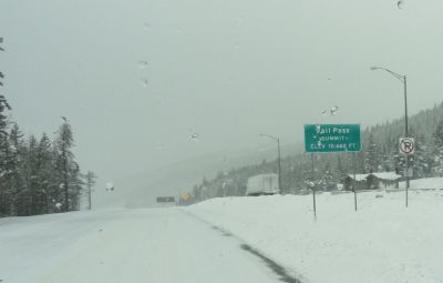 We didn’t get anywhere before the snow did. It hit us 20 miles into the trip, which was over a half hour into the trip because the RV couldn’t climb the hill any faster than 30 or 35 mph. (And I was still passing trucks doing that!)
